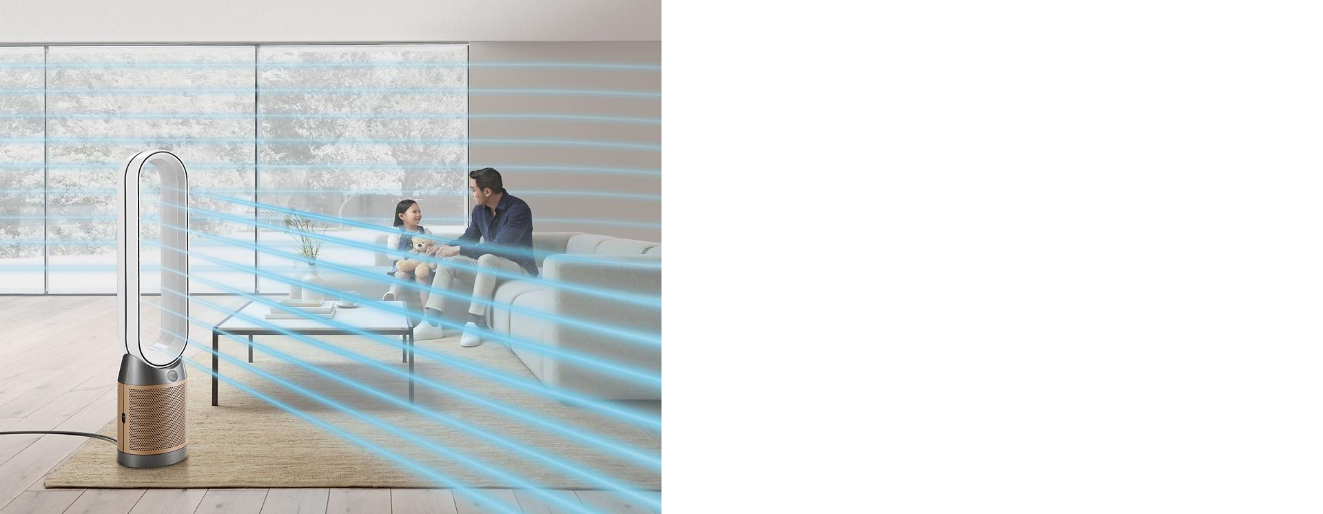 • مروحة منقية للهواء تضخ هواء بارد في غرفة معيشة.