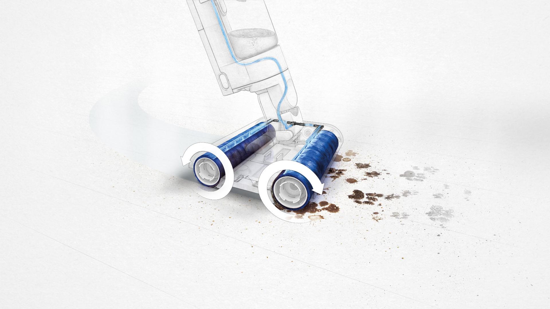 - Highly absorbent microfibre filament rollers counter-rotate to remove spills, debris and dried on stains, all in one go.